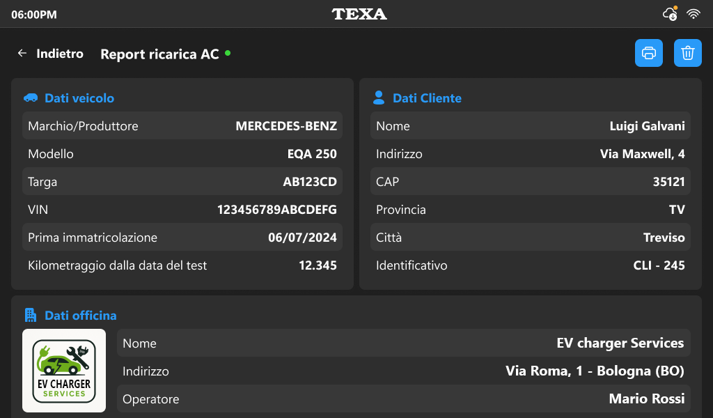 L’autoriparatore in possesso di un TEXPACK E-DIAG CHARGER può fornire al cliente un certificato sullo stato di salute della batteria con la propria intestazione. Servizio incluso nell’abbonamento TEXPACK E-DIAG CHARGER.
