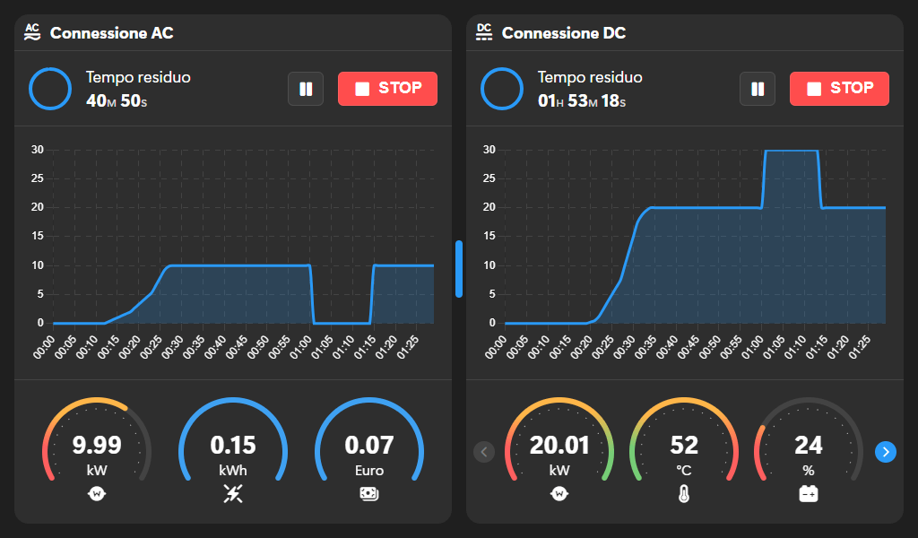 Consente la ricarica simultanea di due veicoli, uno in AC e l’altro in DC, con soglie di potenza impostabili.