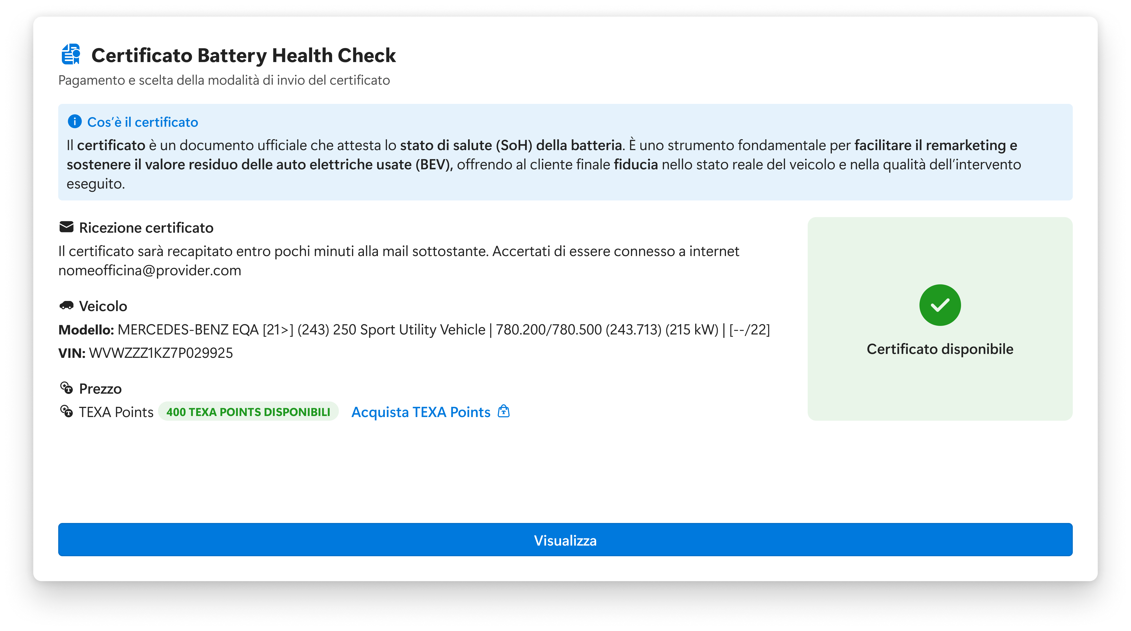 In questo senso TEXA ha sviluppato un processo che, attraverso i parametri ricavati direttamente dalle centraline e la loro successiva elaborazione in cloud, restituisce una stima accurata, in percentuale, dello stato di salute della batteria (State Of Health). Questo procedimento è di serie su E-DIAG CHARGER. Inoltre, il meccanico che voglia fornire al cliente un certificato accreditato relativo allo stato di salute della batteria, può richiederlo direttamente dallo strumento e lo riceverà in pochi minuti al proprio indirizzo di posta elettronica.